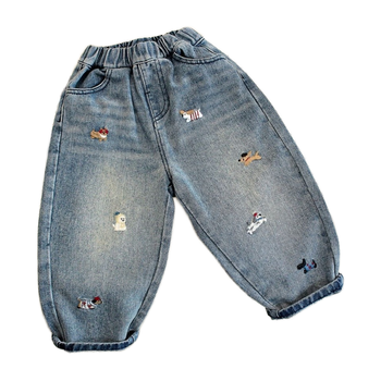2025 Primavera Nova Pesado Bordado Azul Claro Denim Calças Meninos e Meninas Casual Ins Rabanete Calças Jeans Reta