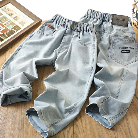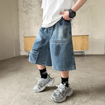 กางเกงขาสั้นผ้ายีนส์ยาวปานกลางแบบลำลองสำหรับเด็กผู้ชายทรงตรงสไตล์ใหม่สำหรับฤดูร้อนของ2025
